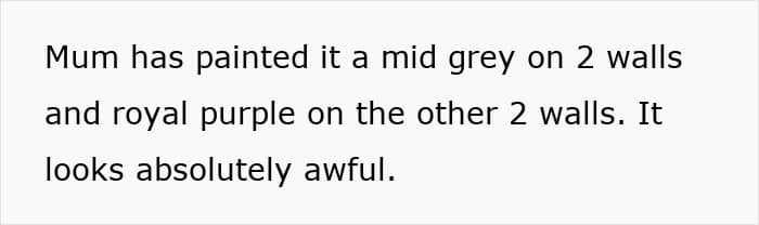 And there our heroine was in for a surprise! It turns out that during this time her mom repainted the walls in her lounge. Previously, they were a soft taupe, off-white, which, according to the OP, was in perfect harmony with their oak furniture. And now two walls were a mid-gray, and the other two were royal purple. But another problem was that the mom’s enthusiasm was clearly not equal to her painting skills.