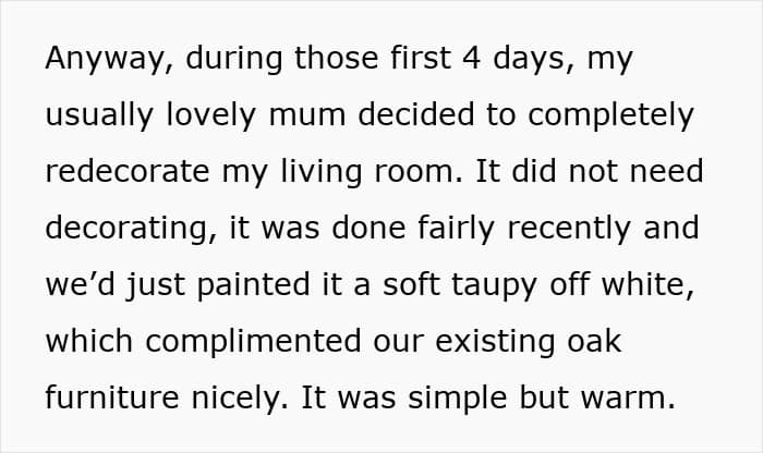When the new mom returned home, she was stunned to see that the mom had redecorated her lounge drastically
