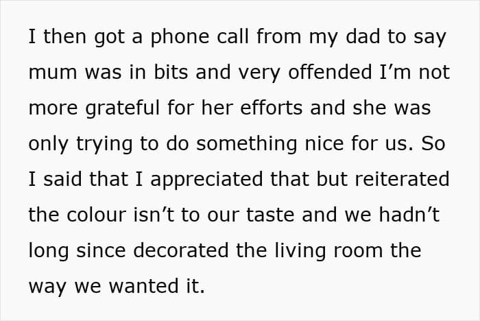 And then the mother texted her, clearly expecting praise. And when the OP delicately hinted that she, to put it mildly, didn’t like at least the colors, that decent lady got incredibly offended. Then the author’s father entered the game, accusing the daughter of upsetting her mom. In short, now our heroine is forced to look at the walls hastily painted in bright colors, and her parents do not talk to her…
