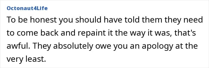 To say that people in the comments were stunned by the brusque behavior of the author’s mom is actually to say nothing. Our heroine received unanimous support, and the only thing the responders reproached her for was that she should’ve immediately put her parents in their place. “Paint it back and send her the bill,” someone aptly advised. And what do you, our dear readers, think about this situation?