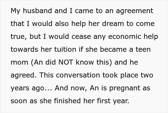 The poster is aware that 16-year-old An always wanted to be an economist, so she told her husband that she would save and offer to pay for An’s college tuition, on the condition she doesn’t get pregnant. The reason behind this strange condition is that An comes from a “dynasty” of teen moms as her mom, grandmom, great-grandmom, and even OP’s husband were all teen parents.