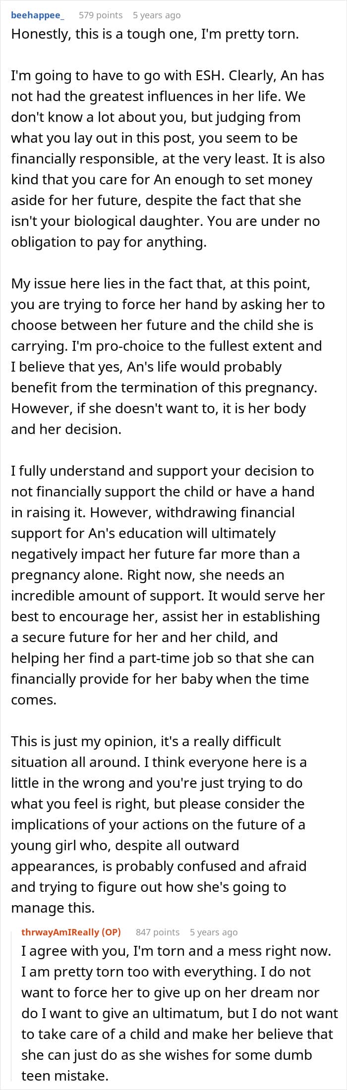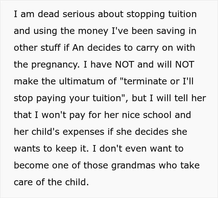 However, An got pregnant and OP was left baffled as it was her one condition that was defied. She tried to convince An that being a teen mom might not be the best decision as it would mean that she could no longer pursue her dream, and suggested she terminate the pregnancy. On the other hand, An’s biological mom is thrilled by the news and the poster couldn’t believe this.