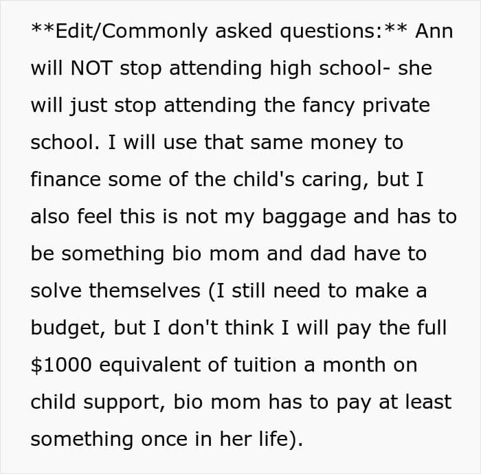 She is well aware that the woman expects OP and her husband to take care of all the expenses of the delivery and child care, which irked the poster as she wanted the biological mom to step up for once. The poster made it very clear to her husband that she would no longer be paying for her fancy high school or college education.