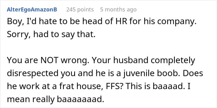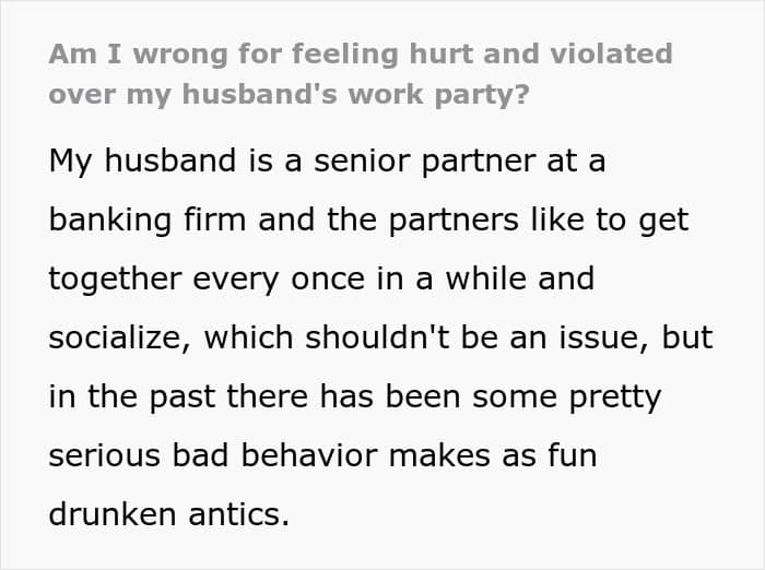 This redditor shared that her husband, a senior partner at a banking firm, spends time with his co-workers after work quite often, which has led to some pretty serious bad behavior, presented as fun drunken antics in the past. The woman opened up about one of such antics that has left her feeling hurt and violated, though her husband believed it was something they should be able to laugh at.