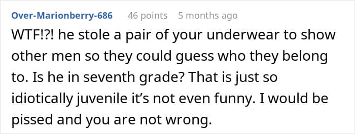 But, as the OP’s example shows, sometimes, it’s not about the amount of time spent, but rather about the activities that time was spent for. The aforementioned survey found that friendships or social activities outside of the relationship were a common reason for fighting, too, and it’s safe to assume that when social activities entail sneaking out with one’s spouse’s underwear in their hand, it doesn’t make the relationship any better.