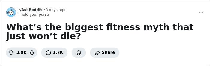 The thread was started a little over a week ago in the AskReddit community by the user u/i-hold-your-purse, who asked netizens: “What’s the biggest fitness myth that just won’t die?” As of today, the thread has nearly 4K upvotes and 1.7K various comments. Moreover, in fact, a heated discussion arose over some of these myths – after all, some of the readers considered them not myths at all.