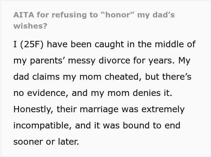 Even Reddit user Parking_Society6027 got caught in her parents’ messy divorce when her dad demanded that she not interact with any of her mother’s new partners. Well, she found this unfair and refused to “honor” his request but he threatened to go no-contact!