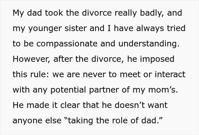 The poster’s father took his divorce badly and made a rule that she and her younger sister would not interact with any of their mother’s partners