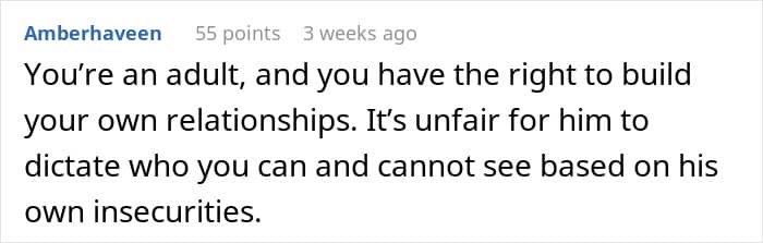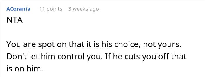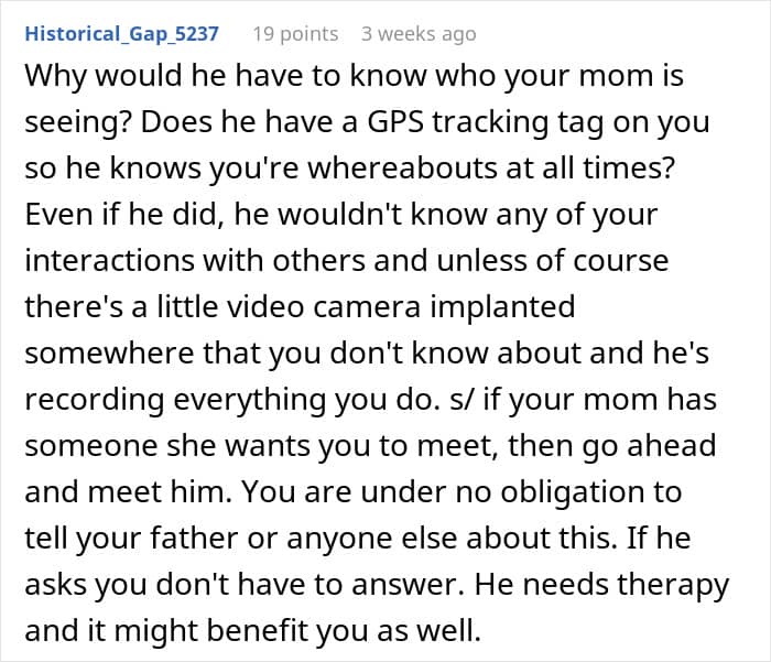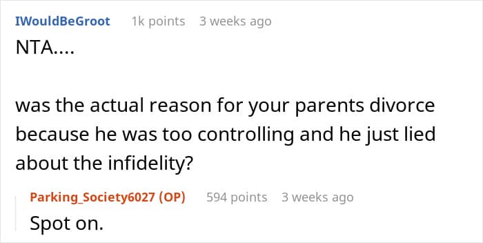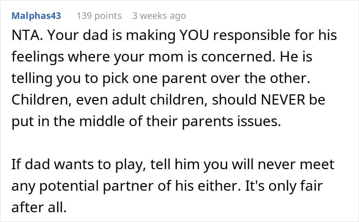 They did not hesitate to call out her father’s actions as completely immature as he is clearly asking the poster and her sister to pick sides, which they shouldn’t have to. People also highlighted that his controlling behavior is a clear indication of why the couple got divorced and he is still projecting his insecurities onto his kids.