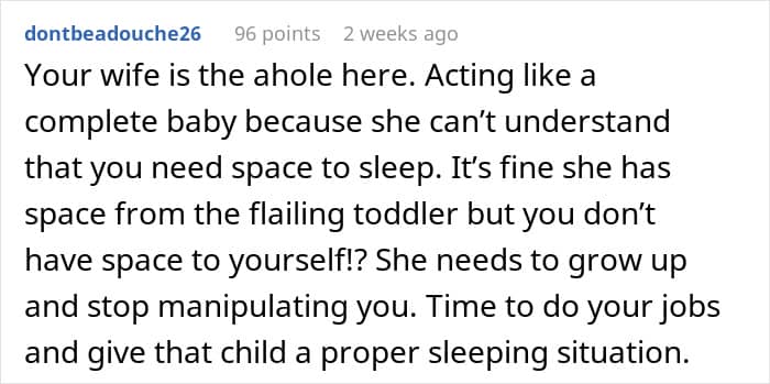 Instead of laughter, his wife was devastated. Furious and hurt, she grabbed her things and went to sleep with the toddler in their full-sized bed. However, the grudge spilled over to he next morning when the OP’s wife barely said a word to him and, leaving him wondering if he was wrong for what he did.