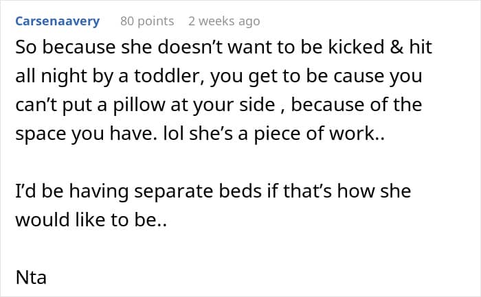 The OP explained that he and his wife shared a king-size bed with a toddler wedged between them. His wife would then go ahead to keep a pillow between her and their child, leaving barely any space for him in turn.
