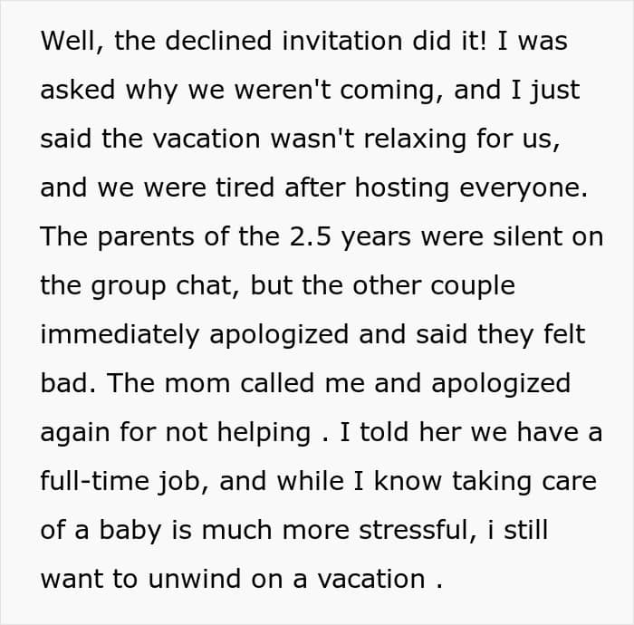 People in the comments on the original post also unanimously supported the author, noting that their friends’ demands seemed entitled. If they want to continue going on vacation with their kids, then it makes sense to stay in hotels only. “No cooking/dining in,” one of the responders noted. And have you, our dear readers, ever encountered something similar? Please share your thoughts in the comments here.