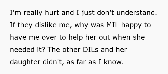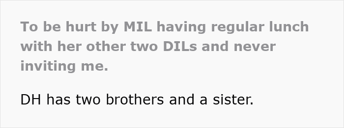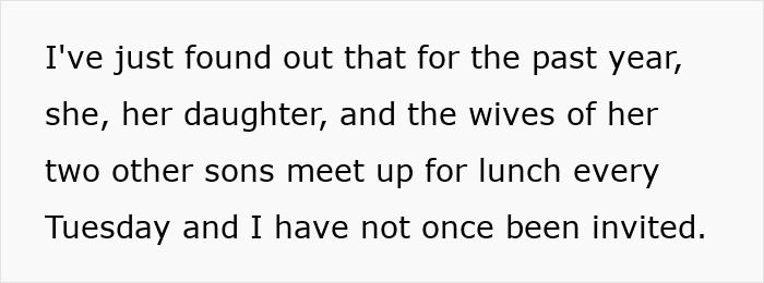 She mentions that she’d helped her mother-in-law out on numerous occasions, so she can’t understand why she’d never been invited in a year of lunches