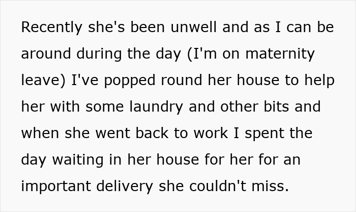 She goes on to say that her mother-in-law hasn’t been well recently, so she’s been helping her out with chores and even spent a whole day at her place to be there for a delivery that couldn’t be missed.