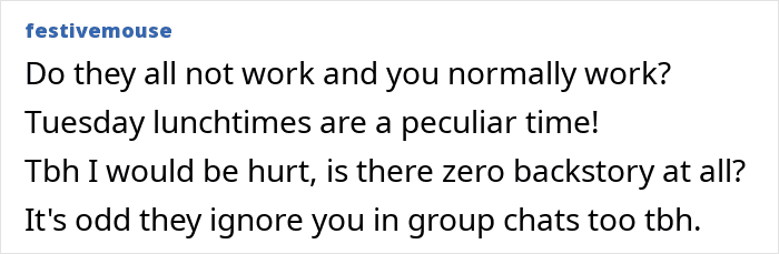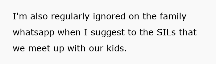 OP then says she’s just found out that her mother-in-law and three sisters-in-law have been meeting for lunch every Tuesday for the past year but haven’t extended an invitation to her even once. She goes on to say her texts are also typically ignored on the family WhatsApp group when she tries to suggest meetups with their kids.