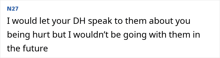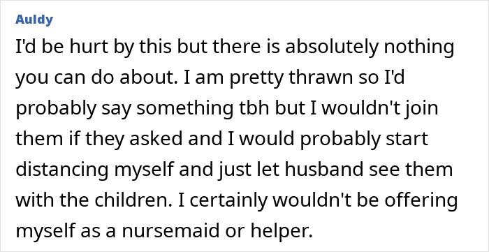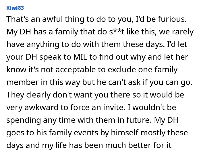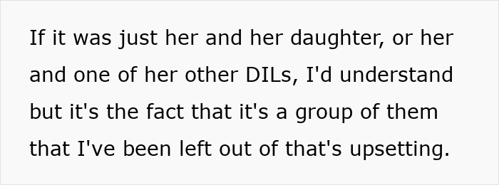 OP’s in-laws did her dirty by leaving her out, but hopefully she can recover from the insult. It’s certainly going to make things awkward the next time her mother-in-law needs a favor, though.