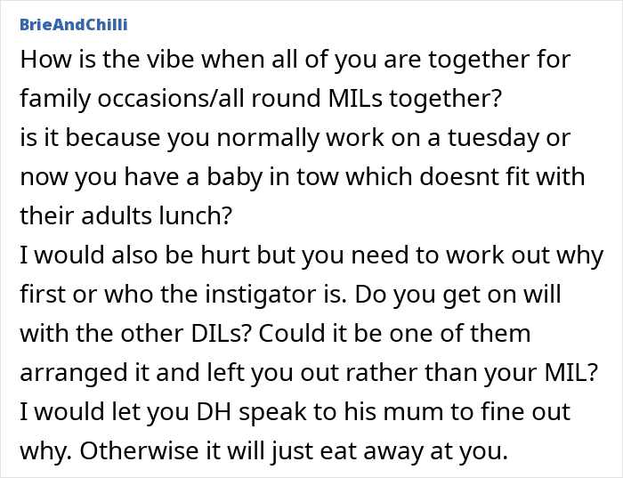 One woman was hurt to learn her mother-in-law and sisters-in-law had been meeting for a weekly lunch for a year and hadn’t thought to invite her along even once. Devastated and confused, she turned to netizens for advice.