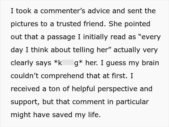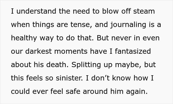 While staying at her friend’s, her husband sent her warm, affectionate messages, reassuring her of his love. It seemed like he genuinely cared about reconciling. This left the OP wondering if what she saw in his journal was just healthy venting or if it was indicative of something deeper and possibly dangerous.