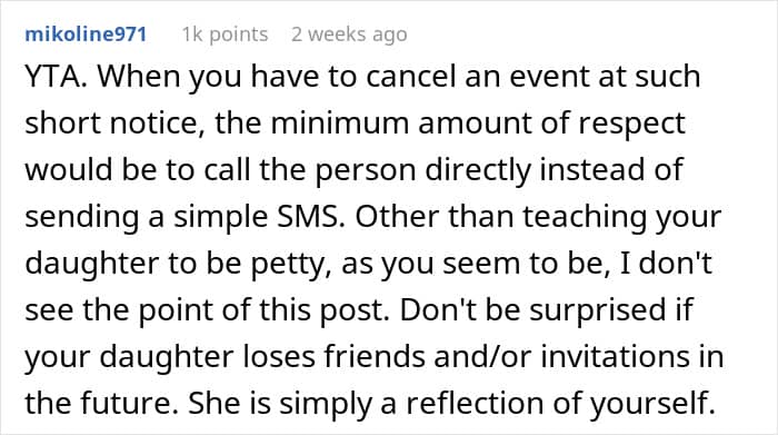 Many people online felt the parent handled the situation poorly and should have prioritized their daughter’s commitment to her friends