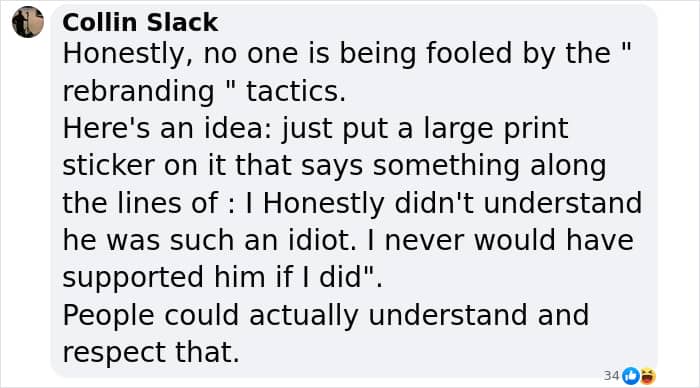 For instance, one user urged the car owners to “Just put a large print sticker on it that says: ‘I honestly didn’t understand he was such an idiot. I never would have supported him if I did.’”
