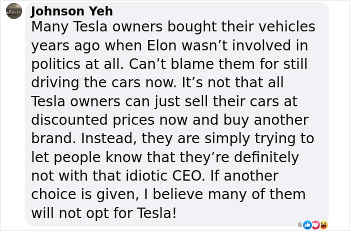 “Many Tesla owners bought their vehicles years ago when Elon wasn’t involved in politics at all,” another stated.