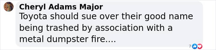 “Toyota should sue over their good name being trashed by association with a metal dumpster fire,” one viewer wrote.