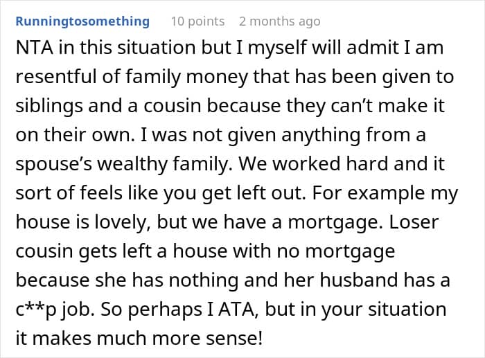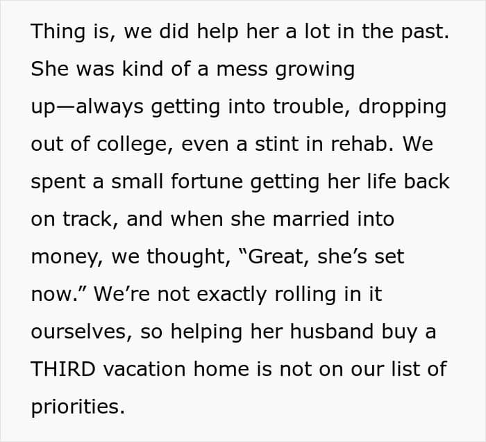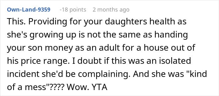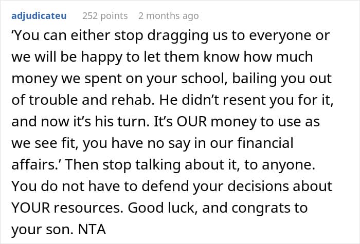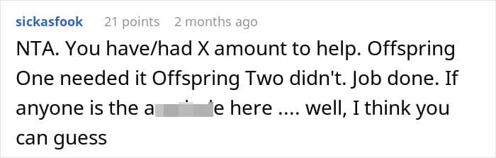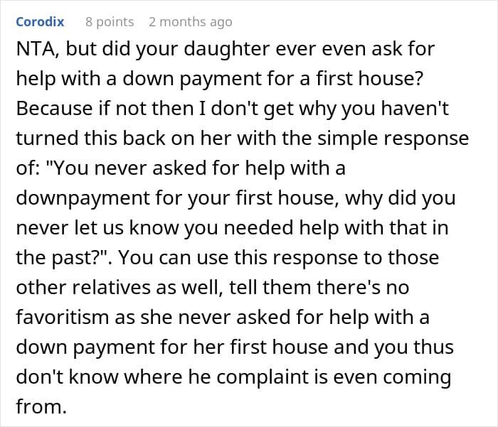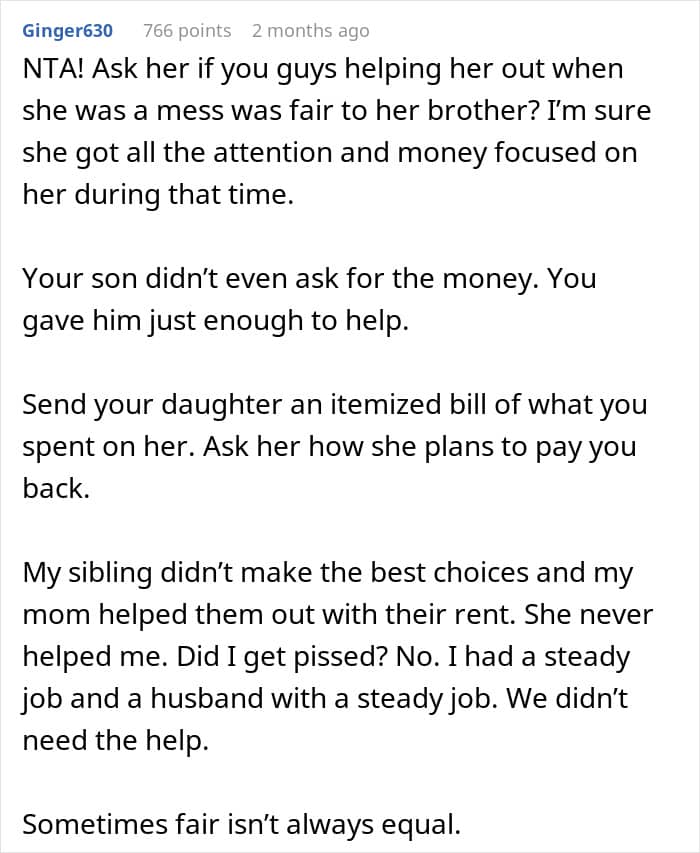 What’s your take on the situation, dear Pandas? Are you siding with the dad for supporting his son when he needed it or do you think this is too much favoritism? How are you supporting your kids as they’re moving into adult life? Have you ever had any family help you with your down payments, college tuition, or bills? Let us know!