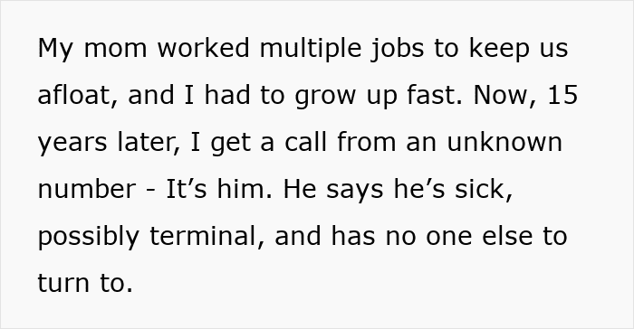 A netizen asked the internet for advice when their absent father showed up 15 years later, needing help. We reached out to the person who made the post via private message and will update the article when they get back to us.