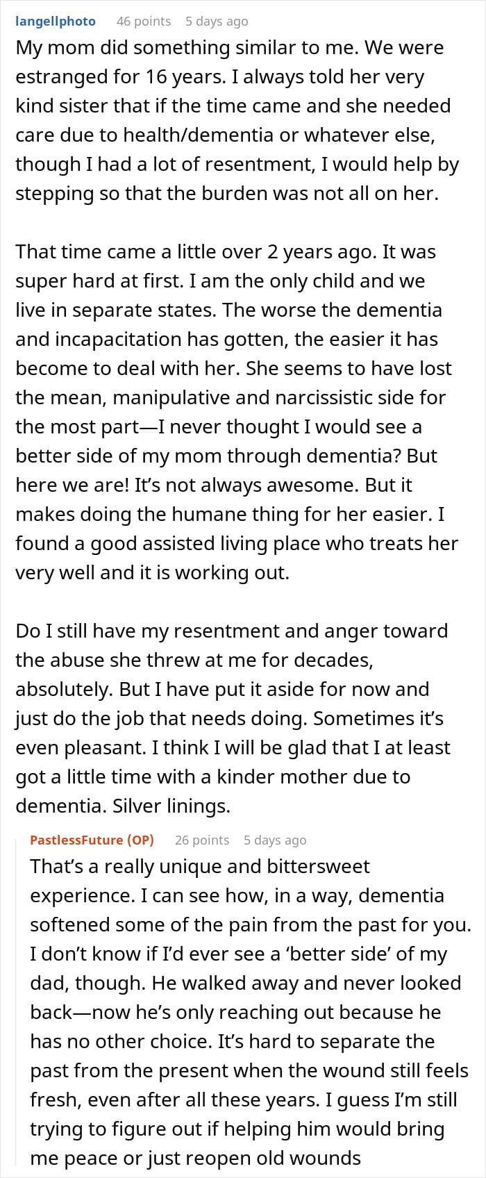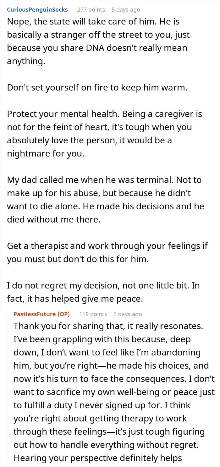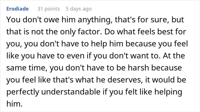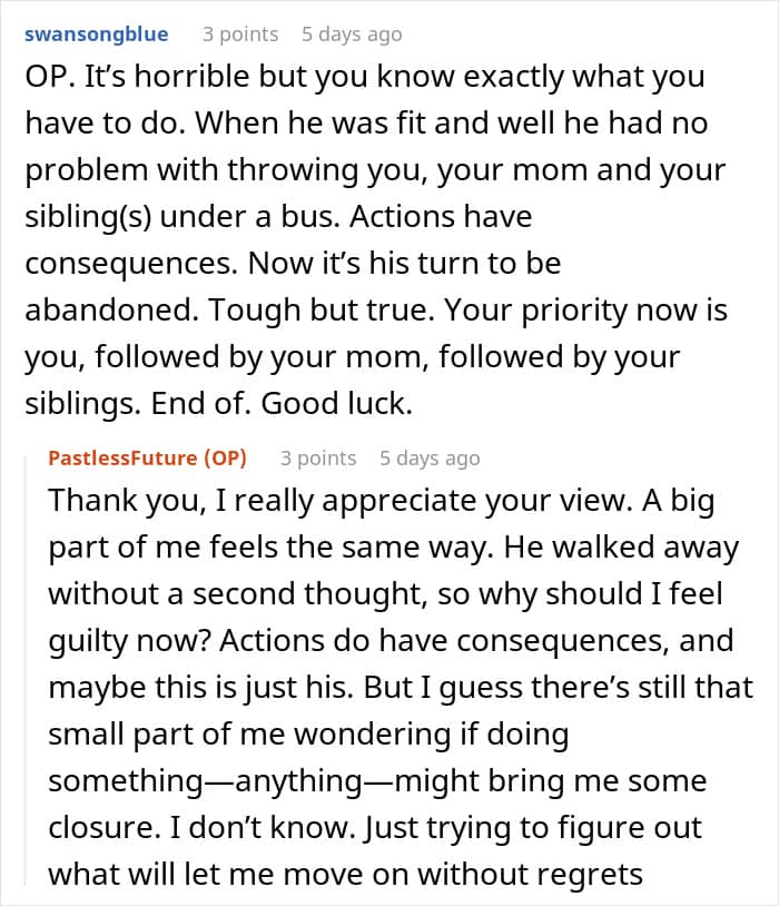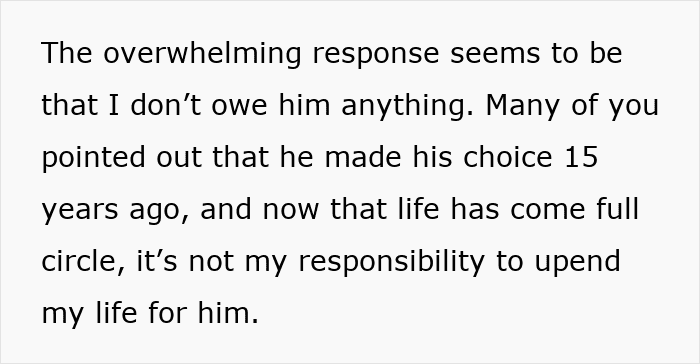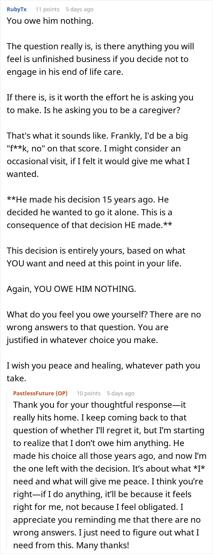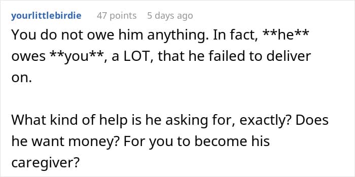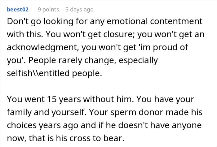 Many of the readers did their best to drive this point home, this man abandoned these children and is now, at best, trying to guilt trip them into helping him. He wasn’t around, he doesn’t get to make rules or demands. A more cynical person would have blocked him immediately, the fact that his netizen even has to ask is a testament to their character.