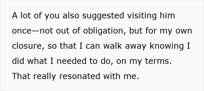 Actually getting closure is important and it’s also important to maintain this framing. They are doing it for themselves, not out of some misguided duty. Importantly, the mom is also still in the picture and does not seem to care either. That should be a pretty good sign, if the woman who actually raised you doesn’t want anything to do with this deadbeat, neither should you.