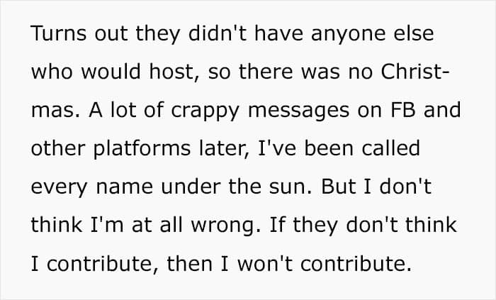 So in response, the woman demanded that her family members leave her house. Later, she let them know very clearly that she wouldn’t be hosting Christmas at her house this time. The redditor then turned to the ‘Am I the Assh*le’ subreddit for their advice whether she was justified in doing what she did.