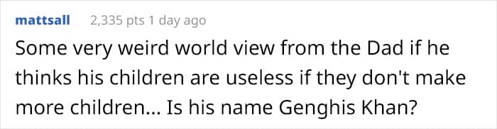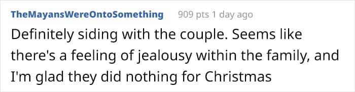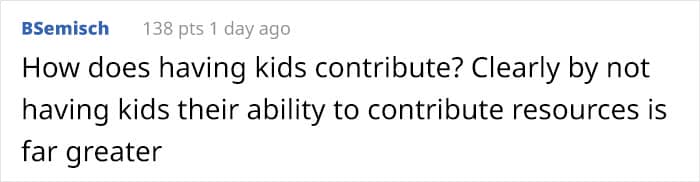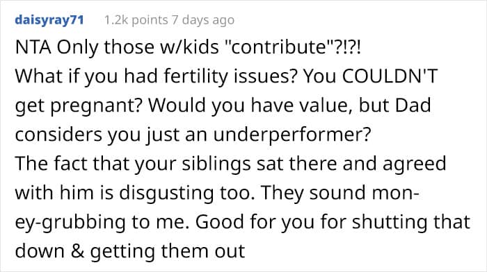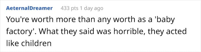 The vast majority of redditors thought that Doesnotcontributes was not in the wrong and blamed her family for believing that the only way to ‘contribute’ is by having kids. However, some internet users thought that she could have responded more calmly. While others thought that the entire family was to blame.