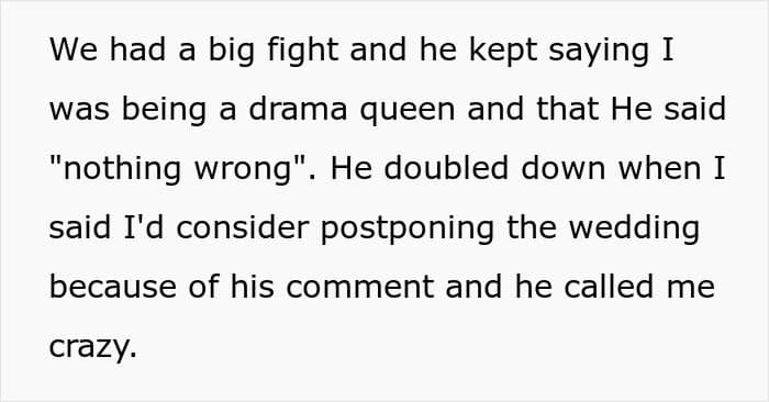 Hurt, she put the wedding on hold, but he insists she’s overreacting