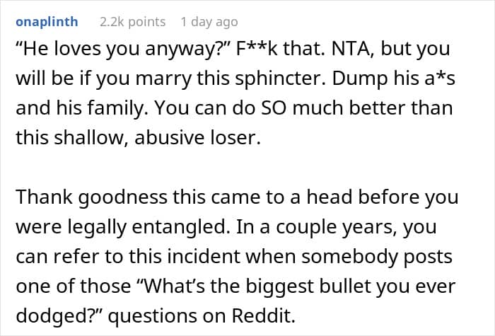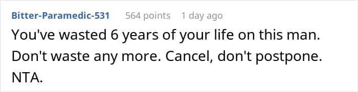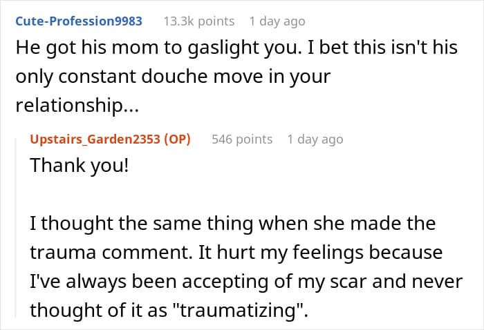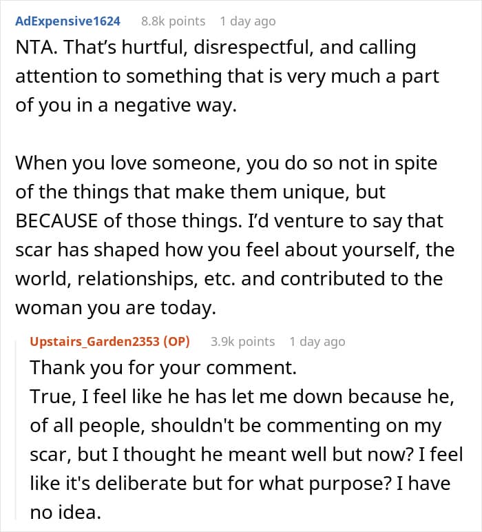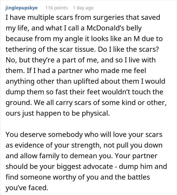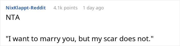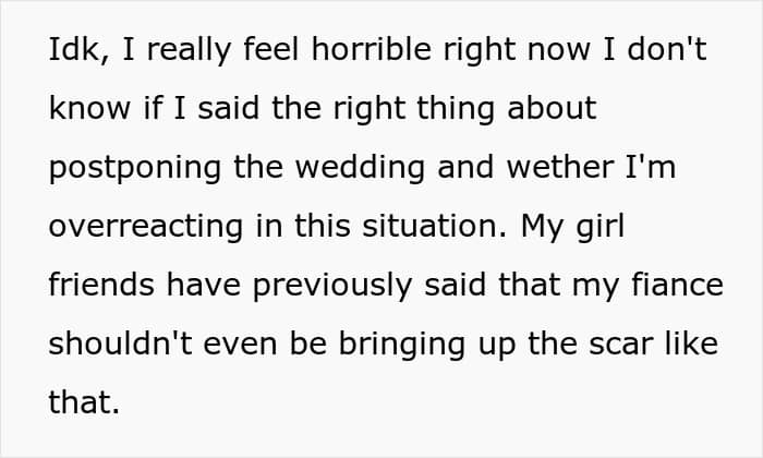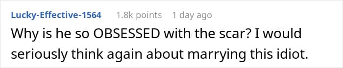 This Redditor thought she’d found her perfect match. Though her fiancé often made comments about her scar, she tried to ignore them—until he cracked a particularly cruel joke in front of his family. The words stung, and she decided to postpone the wedding. Now, she’s unsure if she’s overreacting or finally seeing him for who he really is.