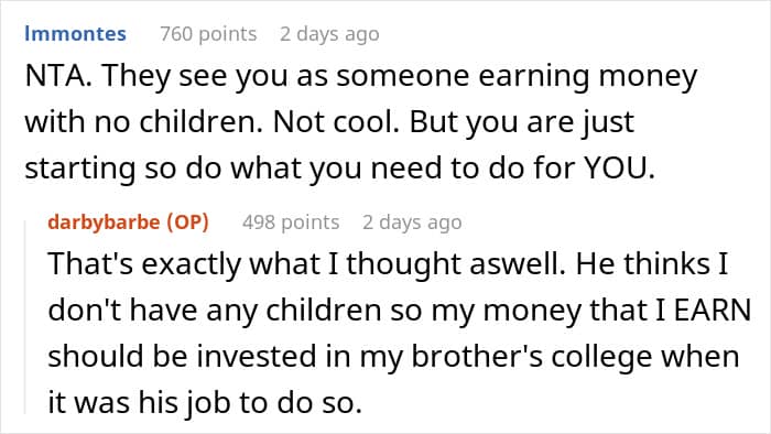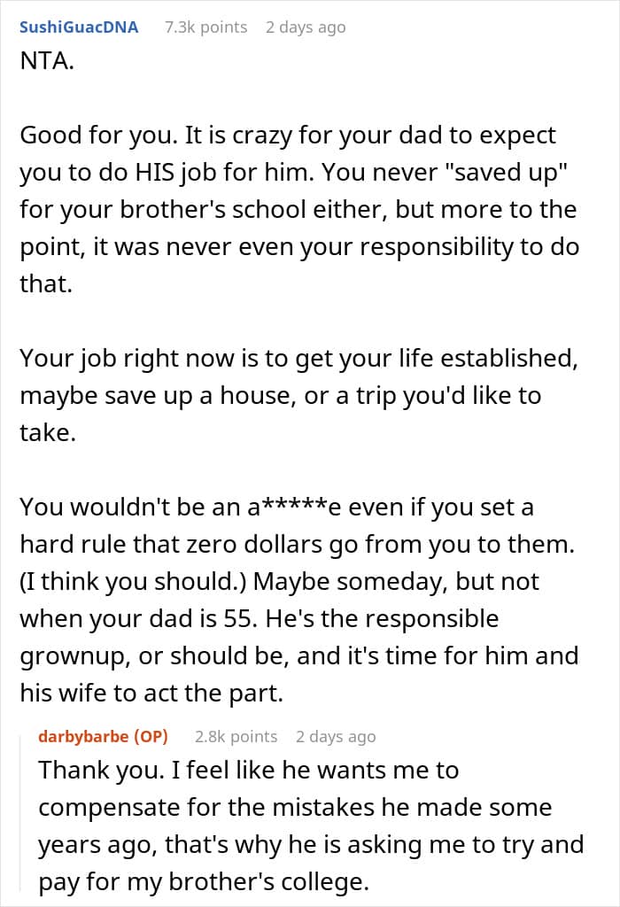 Recently, my dad asked if I could help out with my brother’s college expenses because he and his wife didn’t save up for it. He said I should be able to afford it now that I have a full-time job, and because I “got lucky” with scholarships, it would only be fair if I helped my brother since “family helps family.”