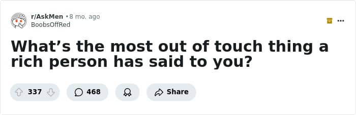 When someone asked, “What’s the most out-of-touch thing a rich person has said to you?” the replies were astounding. From the downright ignorant to the plain old rude, you’d be forgiven for wanting some of these folk to take their private jets and go inhabit a planet far, far away. We has put together a list of the most bizarre statements to come out of the mouths of those with a golden spoon. A few might make you want to gag. We also spoke to WalletHub’s financial writer and analyst Chip Lupo to get some tips for those who’d like to build some wealth of their own.