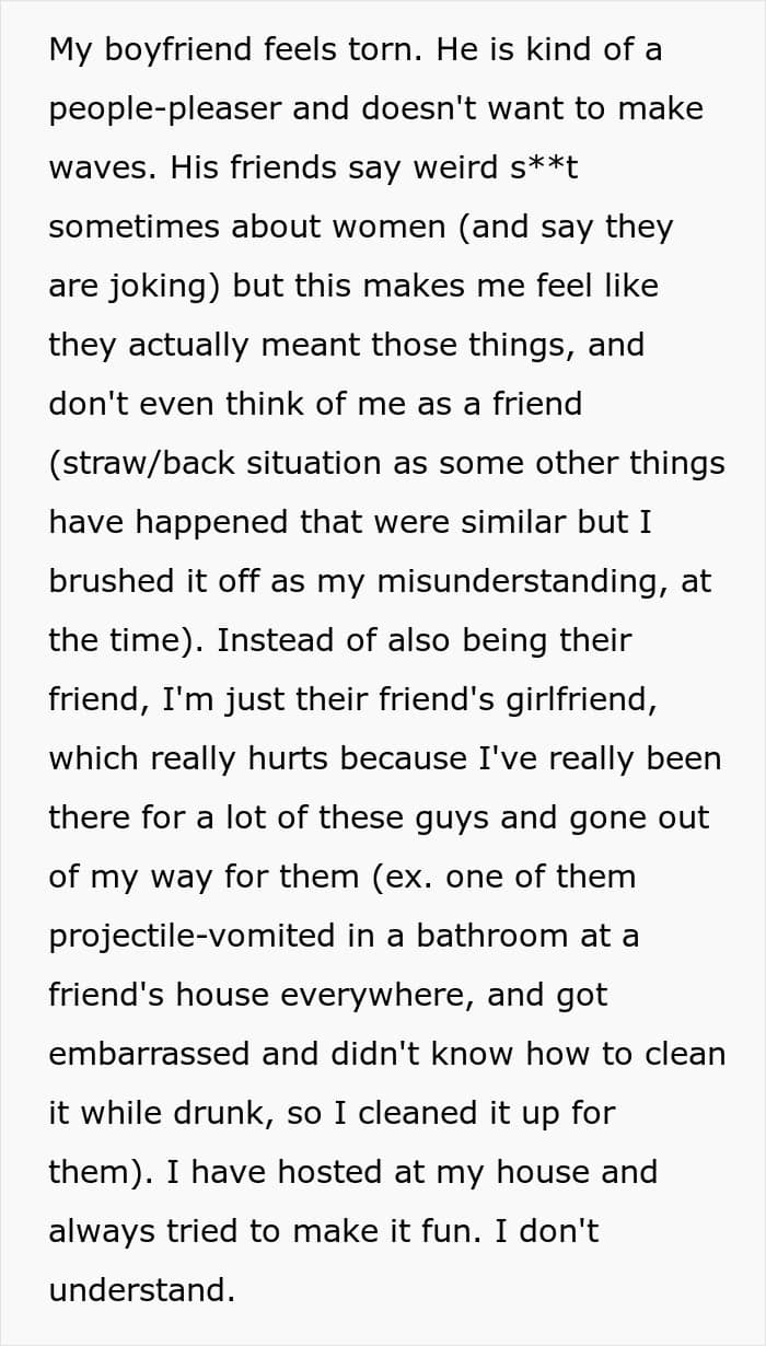 It’s not fair to let someone put time, energy and money into planning a trip only to be told at the last minute that she can’t come. But as the woman in this story shared, it seems like her partner’s friends never actually saw her as a friend. In fact, it looks like they might view all women as lesser than.