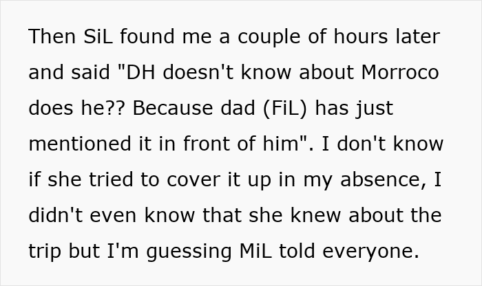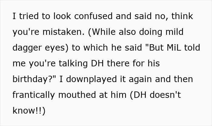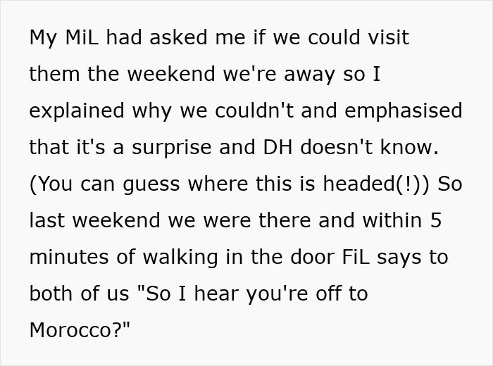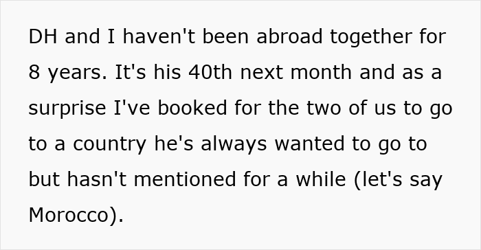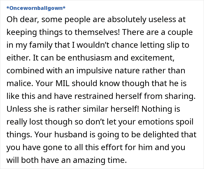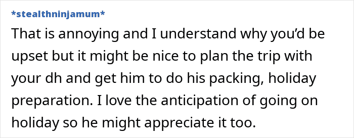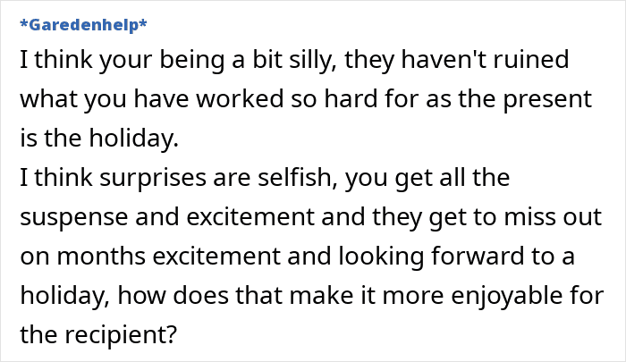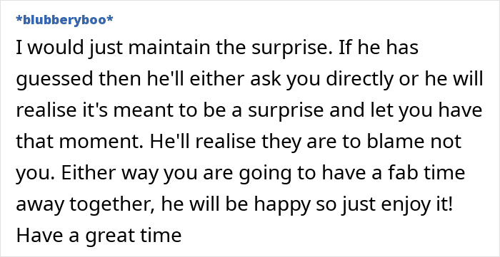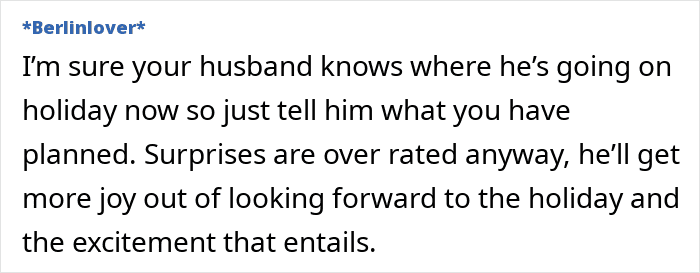 Some felt the wife should continue keeping the trip a surprise, while others didn’t see the point
