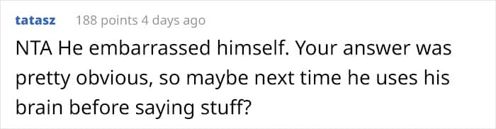 However, the woman felt guilty after the argument and left an update in the post later on: “I might be TA for not waiting to get home to answer his question instead of embarrassing [him] in front of the family and making dinner awkward.” But the AITA community was very supportive of the wife, saying that she is definitely not in the wrong in this situation. As one user put it, “Joke or not, it was completely inappropriate”.