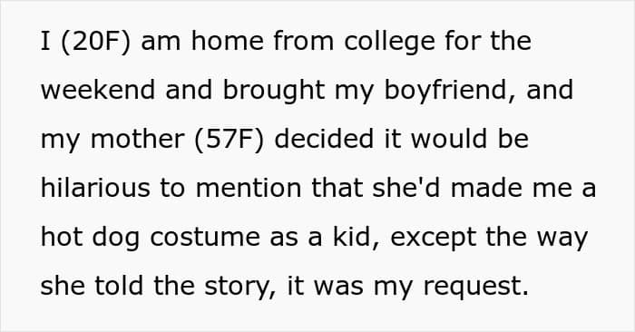 The original poster (OP) loved Snow White and she wanted to dress up like her for Halloween, but her mom blackmailed her into wearing a hot dog costume which turned into a humiliating memory for her. Years later, the mom brought this up in front of her daughter’s boyfriend, but she clapped back!