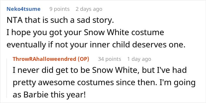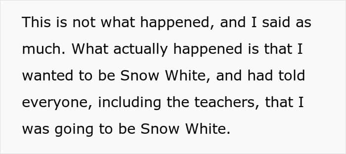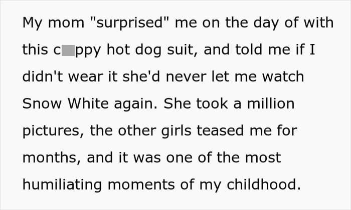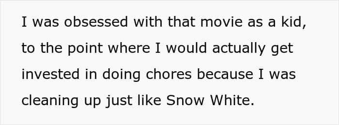 It’s no surprise that just like other kids, OP also fell in love with Snow White and wanted to dress up like her. In the comments, OP explained that her mother wanted to mold her into a “counter-culture girl” so that she would be smarter and better than the other kids, and she generally hated everything that the poster liked.