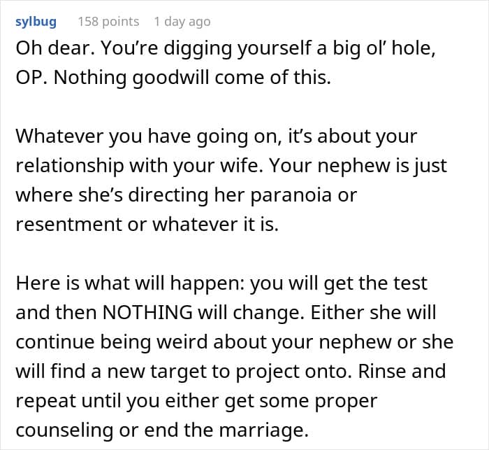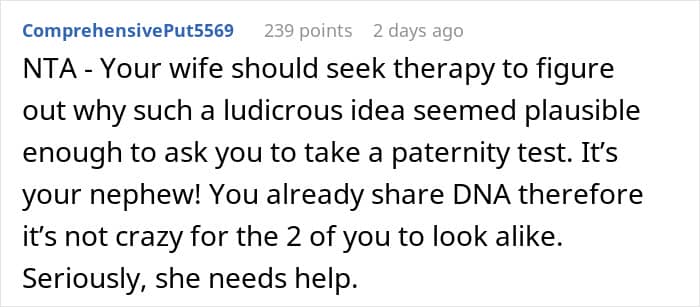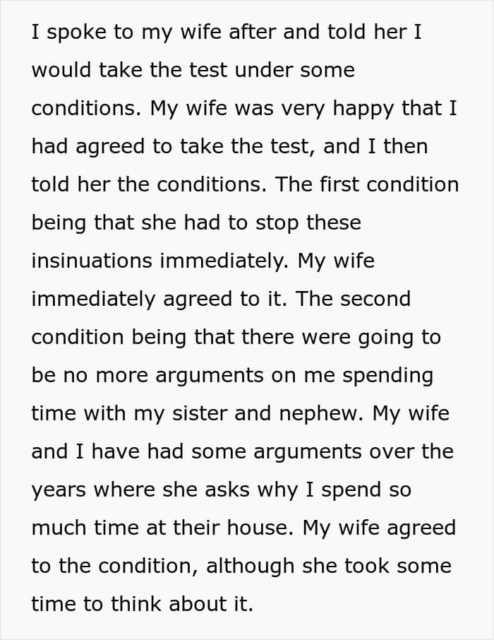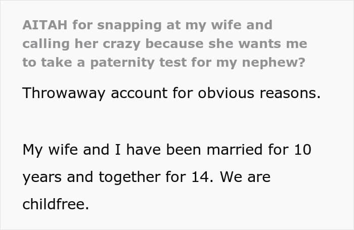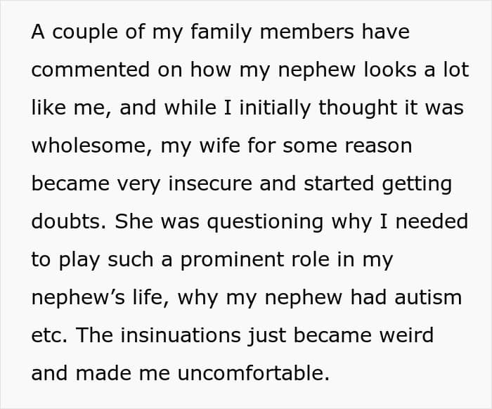 One anonymous man turned to the AITAH online community for advice regarding an incredibly sensitive situation in his family. He opened up that he spends a lot of time with his nephew, who looks like him, which made his wife suspect that he might possibly be his father. Now, she’s demanding that he do a paternity test for his nephew.