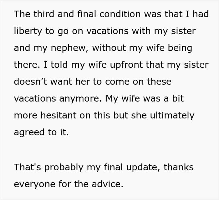 The husband shared an update after he started looking for a compromise and enforcing some healthy boundaries