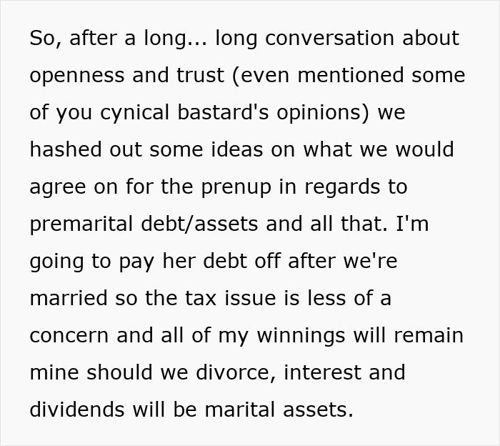 The couple had a long conversation, and they decided that after the marriage the OP would pay off her debt; however, if things went sour between them, then his winnings would remain his if they divorced. At that time, though, the poster and his fiancee decided to enjoy the money they had and were going to go on a vacation.