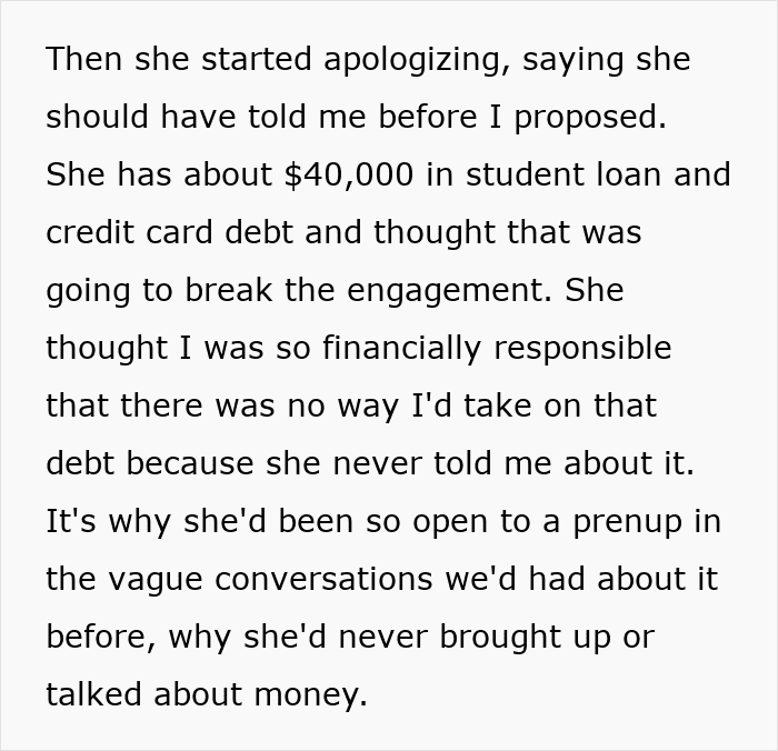 A few days later, the poster gave an update about how things turned out when he revealed the secret to his fiancee, who burst into tears upon hearing the news. Turns out that she had a student loan and credit debt that totaled $40,000. She thought that it might break their engagement, so she kept it a secret from him.