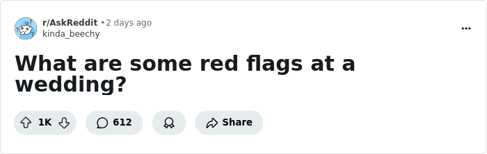 Someone asked “What are some red flags at a wedding?” and netizens shared their best (and worst) stories. So get comfortable as you scroll through, upvote your favorites and be sure to add your own thoughts and experiences to the discussion in the comments section below.