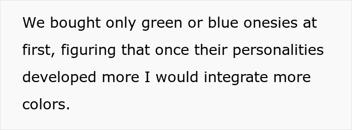 Like you probably expected, dear Pandas, the vast majority of redditors came out in full support of the mom who posted on Reddit. They stressed that it was nothing new for the parents of twins to color-code each kid. What’s more, they noted that, at that age, it’s important parents to, well, parent. It’s hard to talk about true, fully-fledged individuality and making rational decisions for oneself when you’re a year and a half old. (That happens slightly later.)