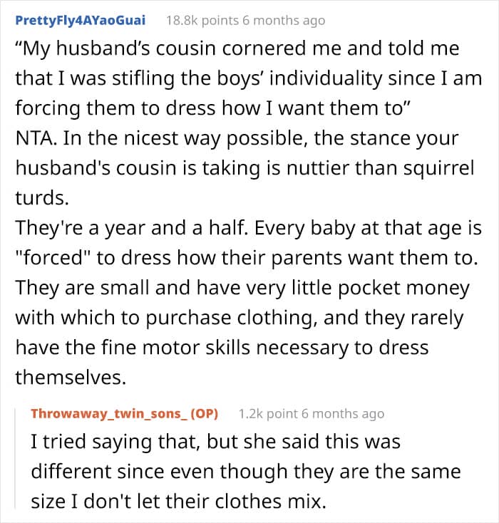 Well, some people don’t think so. In fact, they believe that parents choosing their kids’ clothes might be tantamount to ‘stifling their individuality.’ One redditor, a mom to identical twins, turned to the AITA subreddit to check whether or not she was in the wrong for dressing one of her twins blue and the other green. You see, a cousin of her husband’s had accused her of ‘forcing them’ to dress how she wants. In fact, she went ‘ballistic’ and thought it was unfair to them.
