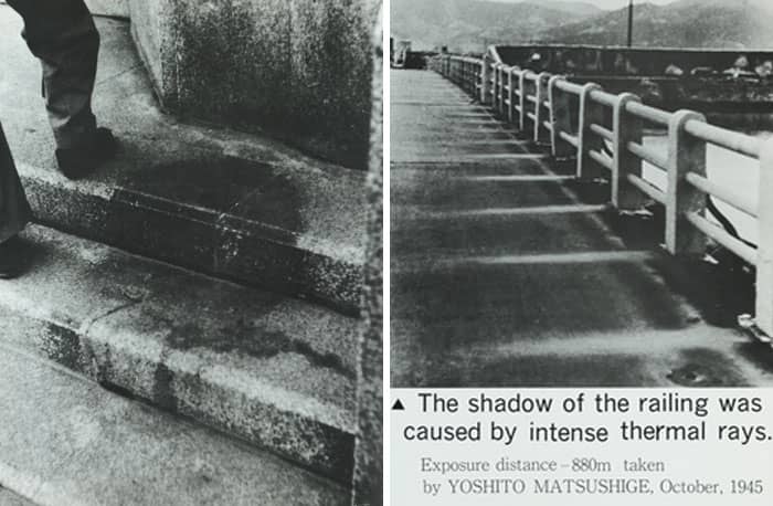 Human Shadow Etched in Stone is an exhibition at the Hiroshima Peace Memorial Museum. It is thought to be the shadow of a person who was sitting at the entrance of Hiroshima Branch of Sumitomo Bank when the atomic b**b was dropped over Hiroshima. It is also known as Human Shadow of Death or simply the Blast Shadow.