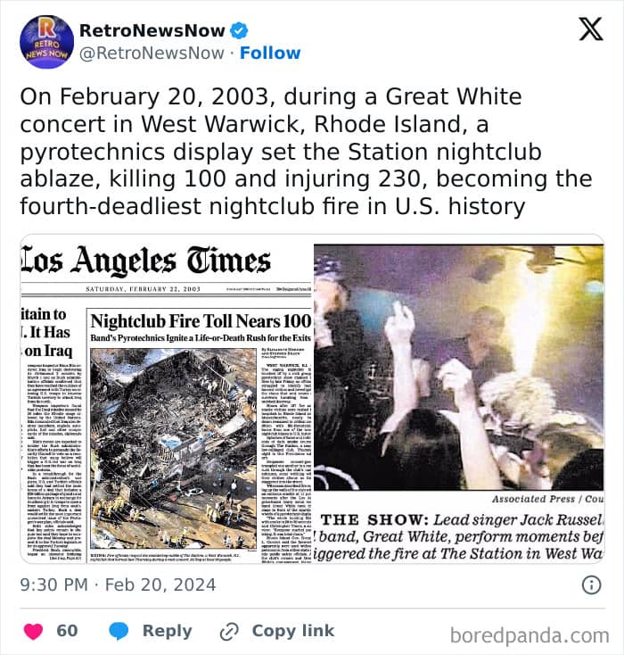 The Station nightclub fire occurred on the evening of February 20, 2003, at The Station, a nightclub and hard rock music venue located at 211 Cowesett Avenue in West Warwick, Rhode Island, United States, k**ling 100 people and injuring 230. During a concert by the rock band Jack Russell’s Great White, an offshoot of the original Great White band, a pyrotechnic display ignited flammable acoustic foam in the walls and ceilings surrounding the stage.